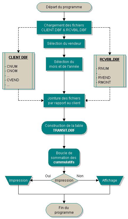 À ce moment, on a déja recueilli les dates qui nous intéressent soit celles du mois courant, de l'année courante, du mois de l'année précédente et celle de l'année précédente. On filtre alors la relation pour ne garder que les records du vendeur choisi ainsi que ceux dont les dates (champ RDATE) sont situées entre le début de l'année courante et la date de fin de mois ainsi que les dates correspondantes de l'année précédente. On trie ensuite cette liste par rapport au client et aux dates et on crée ainsi le fichier temporaite Transit.dbf.